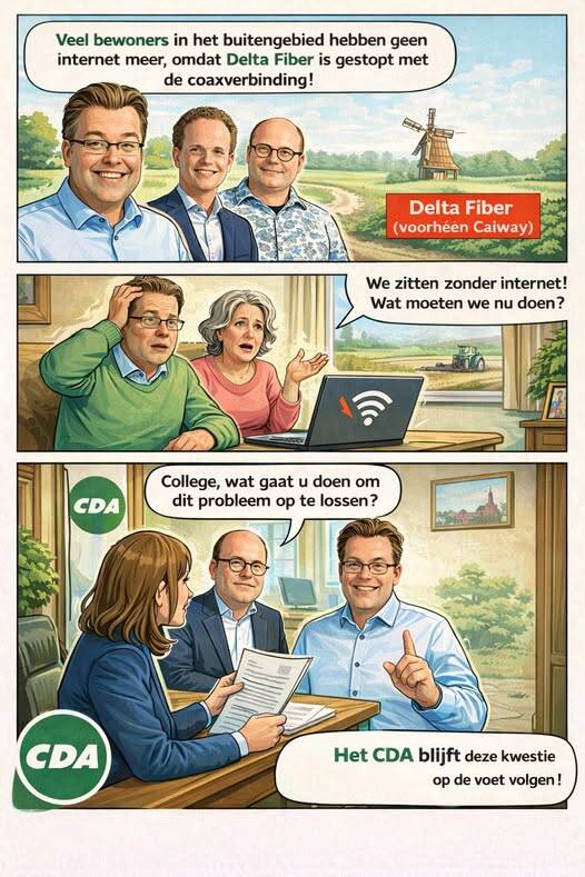 Hopen dat het niet bij woorden blijft maar dat er ook daden komen! De zaak op de voet volgen is niet genoeg, graag actie ondernemen en de bewoners helpen. Ook het CDA zat in het college dat destijds beloofd heeft dat bij de verkoop van het kabelnetwerk aan CIF (later CaiWay en daarna Delta) ALLE BEWONERS van Albrandswaard zouden worden aangesloten op het glasvezelnetwerk .